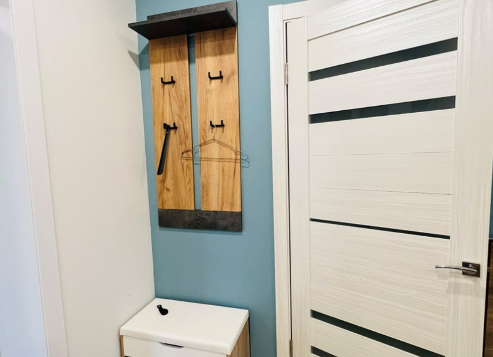 - Мебель: вешалка, диван раскладной, зеркало, кровать двуспальная, прикроватные тумбочки, стол, стулья, шкаф